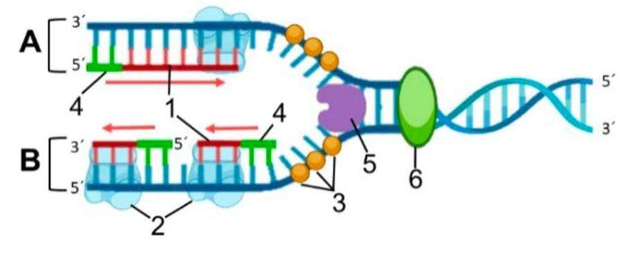 A. En el proceso de replicación del ADN en una célula eucariota, ¿con qué hebra/cadena asociaría cada una de estos elementos? (1 punto)
