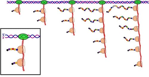 • Poli A-polimerasa: Enzima que actúa durante la maduración de la en . Añade al extremo final 3’ un entre 50 a 250 de adenina que retarda la acción destructiva de las enzimas exonucleasas.