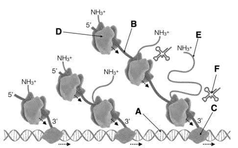 c) Mecanismo de traducción o biosíntesis de proteínas en procariotas. (1 punto)