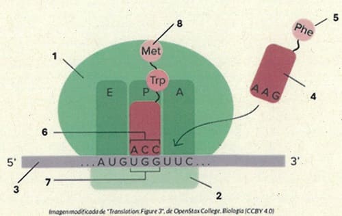 • 5: . Se une al codón complementario del para comprobar que el aminoácido transportado es el correcto.