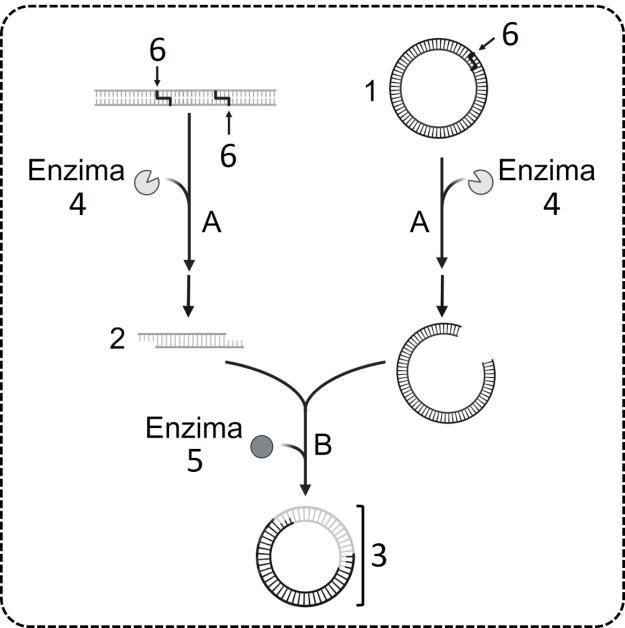 Las enzimas endonucleasas de restricción se encargan de romper el enlace entre los nucleótidos por el sitio específico. Los fragmentos del ADN donante se unen con los plásmidos rotos formando plásmidos recombinantes que contienen el ADN donante.