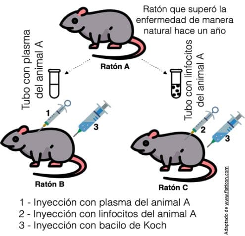 El bacilo de Koch produce la tuberculosis. El ratón A superó esta enfermedad de manera natural hace un año. Se le extrajo sangre, y en un tubo se aisló el plasma (contiene todos los componentes de la sangre salvo las células), mientras que en otro tubo se aislaron únicamente sus linfocitos. El contenido de estos tubos se administró a dos ratones diferentes. Horas después a ambos se les administró el bacilo. El ratón B murió, mientras que el ratón C sobrevivió. (2 puntos)