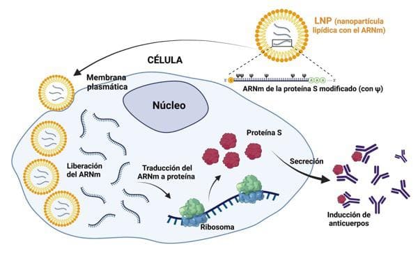 Sin embargo, el ARNm es muy inestable, por lo que es necesario protegerlo, dotándolo de un vehículo que lo encapsula y transporta hasta las células tras su inyección en el organismo. Para esto se usaron nanopartículas lipídicas, unas pequeñas vesículas con distintos tipos de lípidos que forman una membrana cerrada, capaz de albergar el ARNm en su interior y de liberarlo una vez dentro de la célula.
