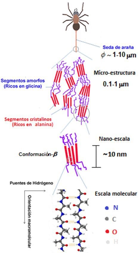 En la figura 1 se muestra un esquema de la estructura de la seda de araña (Wikipedia).
