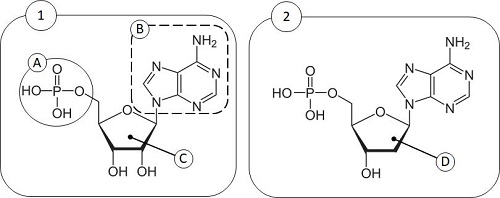 ¿A qué grupo de biomoléculas pertenecen las dos representadas en la figura 2? ¿Qué macromolécula resulta de la polimerización de cada una de estas moléculas? Indique el nombre de los componentes señalados con las letras A, B, C y D, y cite los cuatro compuestos posibles que pueden ocupar la posición B. Especifique el tipo de enlace bioquímico que aparece entre los componentes B y C y entre A y C, y dibuje las reacciones de formación de: a) el enlace entre B y C; b) el enlace entre A y C.