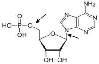 • Ácido fosfórico, H3PO4: Cada nucleótido puede contener uno (como el AMP), dos (como el ADP) o tres (como el ATP) grupos fosfato.