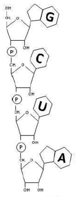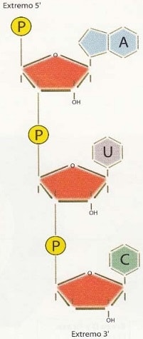 El ácido ribonucleico o ARN está formado por nucleótidos de ribosa, con las bases nitrogenadas adenina, guanina, citosina y uracilo. No tiene, pues, timina como el ADN, salvo el ARNt. La unión de los ribonucleótidos se realiza mediante enlaces fosfodiéster en sentido 5'→3', como en el ADN, pero el ARN casi siempre es monocatenario.