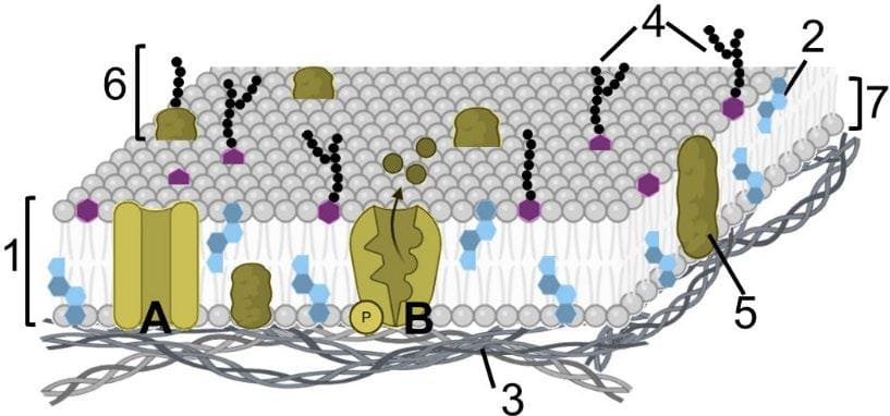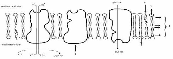 1. Observe el dibujo, que representa la membrana plasmática. Identifique los elementos señalados por los números y explique la función que ejercen en la membrana.