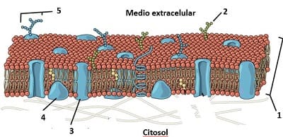 La membrana plasmática es como un mosaico fluido, donde los lípidos se disponen formando una bicapa de fosfolípidos, situados con sus cabezas hidrofílicas hacia el medio externo o hacia el citosol, y sus colas hidrofóbicas dispuestas en empalizada. Las proteínas se intercalan en esa bicapa de lípidos dependiendo de las interacciones con las regiones de la zona lipídica. Existen tres tipos de proteínas según su disposición en la bicapa: