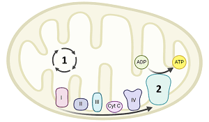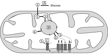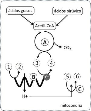 • Ruta metabólica B:  , en la membrana mitocondrial interna. El NADH y el FADH2 producidos anteriormente dejan sus electrones en la cadena de transporte de electronoes y vuelven a NAD+ y FADH. El movimiento de electronos libera energía que se emplea para bombear protones fuera de la matriz y generar un gradiente electroquímico. Al final de la cadena de electrones, el O2 recibe los electrones y goge protones para formar H2O.