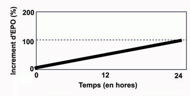 A nivel del mar y en reposo, un deportista de élite tiene una concentración de 20 mUI· mL–1 de EPO en la sangre (la cantidad de EPO se mide en mil unidades internacionales o mUI). Si este deportista se sitúa a 2500 m, ¿qué concentración de EPO tendrá en la sangre al cabo de doce horas? ¿Y al cabo de veinticuatro horas? ¿Por qué es útil esta respuesta fisiológica a la altitud?