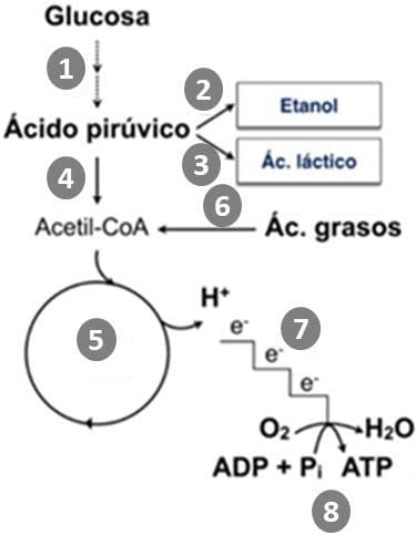• Glucólisis: tiene lugar en el citoplasma de la célula. La molécula de glucosa (seis carbonos) se divide en dos moléculas de ácido pirúvico (compuesto de tres carbonos). Los electrones no son aceptados por el oxígeno, sino por el NAD+. El cambio de energía libre representa una proporción relativamente pequeña de la energía total de la molécula de glucosa.