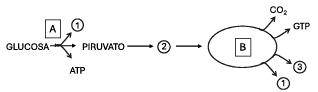 a) Diga cómo se denomina el compuesto indicado con el número 1. Siendo el número 2 el compuesto ácido pirúvico (piruvato), indique los procesos señalados con las letras A, B y C. (1 punto)