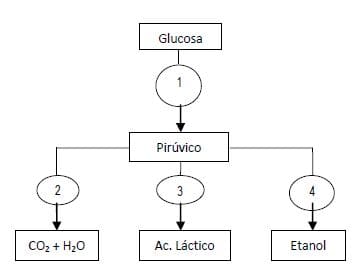 • Glucólisis: tiene lugar en el citoplasma de la célula. La molécula de glucosa (seis carbonos) se divide en dos moléculas de ácido pirúvico (compuesto de tres carbonos) y se obtiene 2 ATP y 2 NADH. Después, el ácido pirúvico puede seguir dos vías distintas: