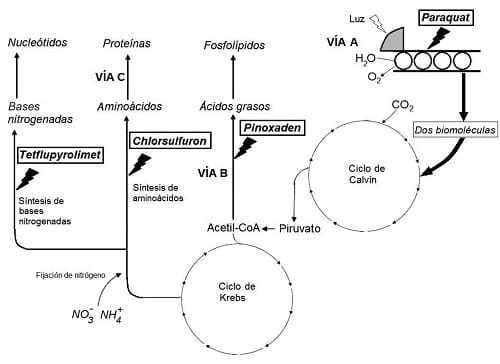 Los herbicidas son productos que se utilizan para eliminar las malas hierbas. La acción de muchos herbicidas se basa en inhibir enzimas clave de las vías anabólicas vegetales. Paraquat®, Pinoxaden®, Chlorsulfuron® y Tetflupyrolimet® son ejemplos de estos tipos de herbicidas.