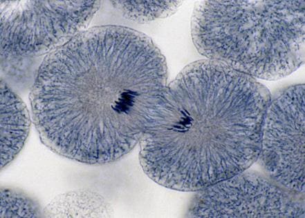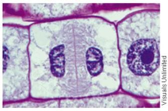 • En la mitosis de las células animales, se produce por estrangulamiento de la célula en la parte central por contracción de los filamentos de actina y miosina, con la formación de un anillo contráctil.