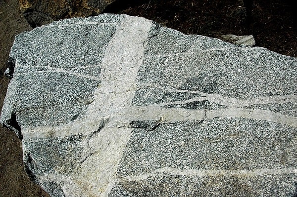Los diques de cuarzo están formados casi exclusivamente por cuarzo. Son las rocas más ácidas de todas las rocas magmáticas, con incluso más del 99% de sílice en su composición. El cuarzo resiste bien la erosión y suelen destacar estos diques sobre la superficie por ser más resistentes que las rocas encajantes.