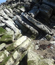 Capa de areniscas sub-horizontal con estratificación cruzada (por migración de dunas subacuáticas: megaripples). Indica polaridad (las láminas oblicuas tienden a ser paralelas a la base  del estrato e inclinarse más hacia la parte superior), y sentido de la (paleo) corriente que movía las dunas  (de izquierda a derecha)