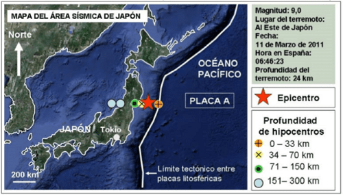 En el mapa de la figura se muestra la localización del epicentro de un terremoto de magnitud 9,0 que sucedió al este de Japón, a una profundidad de 24 km. La línea blanca gruesa representa el límite entre dos placas tectónicas. También se observa la localización de otros terremotos que han ocurrido anteriormente en esta región.