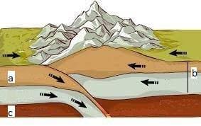 a) obducción, b) deslizamiento lateral entre placas, c) ascenso de