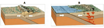 1- En la imagen se representan dos bordes típicos de placas tectónicas, A y B. Para cada uno de ellos responda a las siguientes cuestiones: