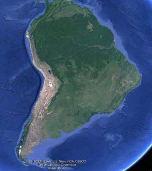 2- Google Earth es una herramienta muy útil para estudiar la diversidad geológica del Planeta. Aquí se ve el fondo del océano Pacífico y el continente de Sudamerica con una larga cadena montañosa al oeste (en marrón). Con ayuda de la Tectónica de Placas, conteste a las siguientes preguntas sobre este majestuoso rincón del Planeta Tierra.