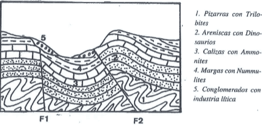 1. Calizas con Nummulites 2. Margas con Goniatites 3. Conglomerados con restos de Dinosaurios 4. Basaltos