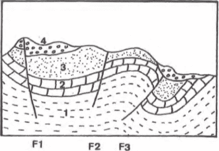 8. (1 punto) Describir la historia geológica del siguiente corte. Identificar los diferentes procesos morfogenéticos que han tenido lugar. Describir también la deformación de la unidad 4.