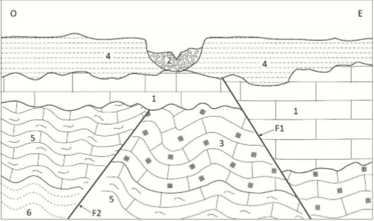 Leyenda: 1. Brechas; 2. Gravas, arenas y arcillas; 3. Pizarras carboníferas; 4. Margas yesíferas; 5. Limolitas; 6. Areniscas