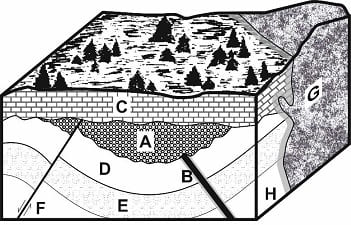 A partir del siguiente bloque diagrama y sus correspondientes datos litoestratigráficos, resolver los siguientes apartados (2 puntos):