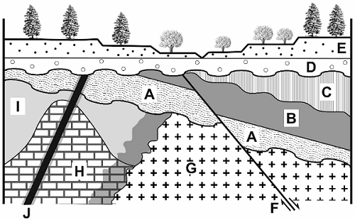 b) Historia geológica. En ella hay que indicar, correctamente ordenados, las discontinuidades estratigráficas que se vayan produciendo, posibles episodios de transgresiones-regresiones marinas, tipo de falla, tipo de plegamiento, tipos de intrusiones ígneas y tipos de metamorfismo (1,5 puntos)