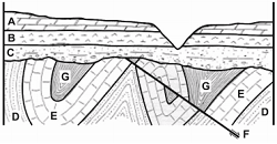 B, C, D – Capas metamórficas que originalmente fueron estratos sedimentarios continentales (Ordovícico inferior)
