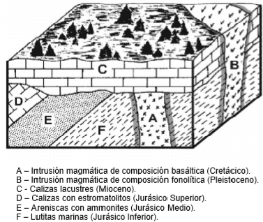 b) Historia geológica. En ella habrá que indicar, correctamente ordenados, las discontinuidades estratigráficas que se vayan produciendo, posibles episodios de transgresiones-regresiones marinas, tipos de plegamiento, falla, intrusiones ígneas y metamorfismos (1,5 puntos)