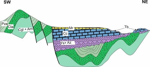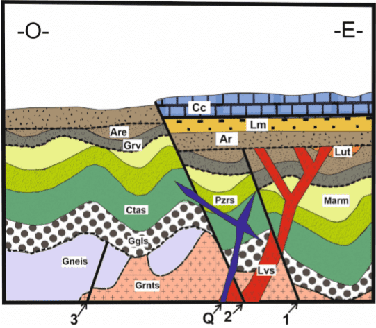 En el siguiente corte geológico orientado SO-NE, se sitúa una zona mineralizada de la que se extrae pirita, blenda y galena con plata, en filones creados por chimeneas volcánicas que reaccionan con las rocas encajantes.