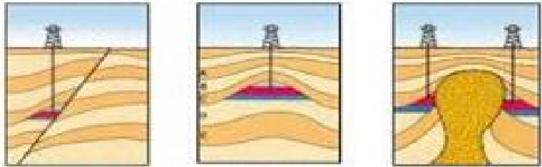 • Si los hidrocarburos se encuentran con una roca impermeable o una estructura geológica que le corte el paso en su camino a la superficie (trampa petrolífera) y una roca almacén que permita que se acumule, se formará un yacimiento de petróleo.